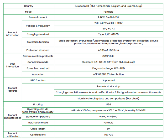 It features a comprehensive safety protection system. In terms of basic protection, it features multiple core protections, including overcurrent, overvoltage, undervoltage, overheating, leakage, ground fault, lightning protection, and short circuit protection, which can handle common anomalies during the charging process.